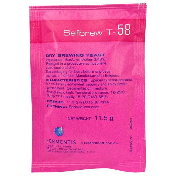 Fermentis's T-58 is a dry Belgian yeast known for producing bubblegum and banana fruitiness as well as some spice and pepper notes. Fermentis claims on its product sheet that phenolic characteristics are dominant, but many brewers tend to get more fruitiness, with the spice coming out mainly on the lower end of fermentation. Fermentation temperatures are crucial in the balance of fruity esters and peppery phenolics and can be manipulated through temperature control. T-58 sediments well, forming a tight layer on the bottom of the vessel, and is recommended for bottle and cask conditioning. It is a great dry alternative to many liquid Belgian strains and is capable of creating breathtakingly beautiful beers.