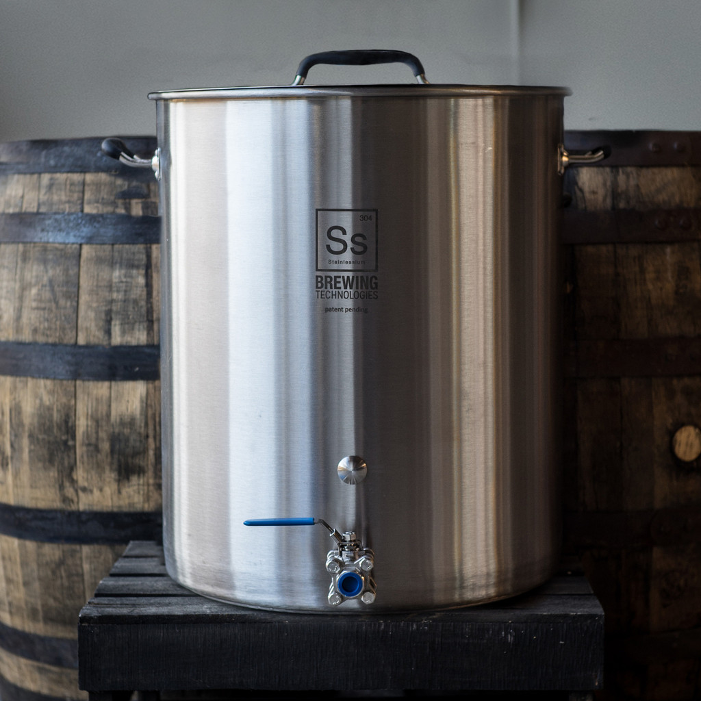 Ss BrewTech has done it again, taking brewing equipment to an innovative next level.  These are a premium lineup of feature rich all Stainless Steel Brew Kettles, designed to keep you brewing for a lifetime. ,What really sets this boil kettle apart from the rest is the first ever integrated trub dam and pick-up tube assembly that Ss has designed into the back of the 304 Ss 1/2" ball valve (3pc).  It is a brilliant little piece which will help with a more efficient whirlpool, leaving more trub in the kettle, and bringing more wort to the fermenter!  Other features include robust triclad bottom, internal gallon markings, and strong riveted handles with molded silicone grips that can hang the lid.,Features:,,,Heavy duty 18 gauge 304 Stainless,,,1.2 x 1.0 height to width ratio,,,Triclad bottom - no scorching!,,,Silicone handles for safe handling,,,Internal etched gallon markings (start at 3 gals!),,,Thermometer port positioned at 9 gal level,,,High Quality Weldless Fittings,,,Robust riveted handles for safety,,,Hang lid on side handles,,,Optional bimetal thermometer,,,Optional coupling for thermometer,,,Dimensions: 23.7" H x 19.7" W,,,31.1 Gallons total volume