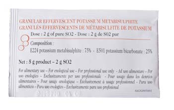 Potassium Metabisulphite, (often referred to as "SO2", "sulphites" "meta", or "meta-bi") has several uses in winemaking. At the crush, sulphites are generally used to help control the spoilage bacteria and indigenous yeast that may already be present both on the fruit and in the winery (i.e. on the picking bins, processing equipment, tanks, tubing, etc).,,The amount generally used is enough to inhibit most of the unwanted organisms but not enough to hinder a cultured yeast, which has a higher tolerance to sulphites than most of the indigenous organisms do. This inhibition effectively "wipes the slate clean" for the cultured yeast to step in and rapidly colonize the must so that it can effectively dominate the subsequent fermentation.,,In addition, sulphites also help to inhibit the enzymatic browning of both musts and finished wines so that all of their delicate complexities can be preserved. Later, during storage and in the bottle, sulphites at the proper levels will further protect a wine by continuing to inhibit spoilage organisms, as well as by scavenging oxygen.,,Note that the exact amount needed to effectively do the job is determined by the pH of the wine. Refer to our MoreManuals! on Red or White Winemaking or one of the winemaking books that we offer for a complete explanation on how to properly manage sulphites.,,In addition, it's important to keep in mind that free SO2 levels fall faster in wood cooperage than in glass or stainless, so if you are using a barrel you will most likely need to manage sulphite levels more closely.,,The most common form of Metabisulphte is as a powder. 1/4 tsp adds 50ppm to 5 gallons of must. Used Metabisulphite loses potency with time and should be replaced every year to assure that you are getting correct levels. You can use old Metabisulphite to make solutions for sanitizing equipment.,,A convenient way to add sulphites is to use pre-mearsured Effervescent SO2 packets. The granules are effervescent, much like Alka-Selzer, which helps them to dissolve. The granular composition is varied, allowing the product to dissolve at multiple levels in the tank or barrel.,,The 2 gram size will add 9 ppm sulphites to a 60 gallon barrel or 18 ppm sulphites to a 30 gallon barrel. The 5 gram size will add 22 ppm to a 60 gallon barrel.
