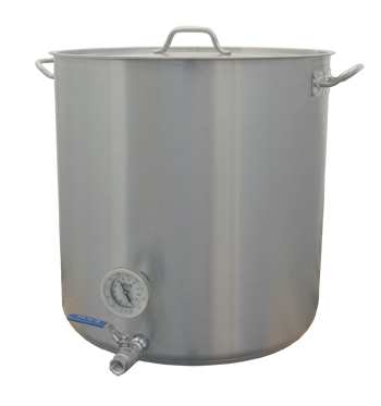 Our famous MoreBeer! Heavy Duty Brew Kettles are now fully assembled Mash Tuns! Each kettle has two 1/2" threaded couplers welded to them, a thermometer, and a false bottom. The bottom outlet is very unique with male threads on the outside (for connecting a ball valve) and female threads on the inside for connecting whatever you wish. Check out these features!,,They Will Last a Lifetime!,Constructed from durable, long-lasting stainless steel, these kettles are virtually dent proof. Over the years, we have heard countless stories from brewers who have ruined their thin-walled kettles by dropping and denting them. This is no longer an issue with these beefy, super-thick kettles.,,Tri-Clad Bottom,Our kettles are built with a tri-clad bottom featuring an aluminum core sandwiched between two layers of stainless steel. Aluminum allows for even heat distribution while the food-grade stainless steel is the only metal in contact with your wort. Even heat distribution eliminates hot spots, which prevents scorching of your malt and makes cleanup a breeze!,,Seamless - Made from a single piece of metal,Our kettles are drawn, meaning the kettle is made from one piece of stainless steel. No welded seams.,,Heavy Duty Handles!,The handles on these kettles are just as heavy duty as the rest of the kettle. This is because they are made from rolled stainless steel, which is strong and easy on your hands.,,Mash Tuns include a false bottom and a high quality thermometer. The 18-gauge stainless steel false-bottom features a perforation of 3/32 holes on 5/32 centers. This is considered standard commercial sizing. If the perforation is larger, you get too much grain husk material falling through. If the perforation is smaller you risk stuck mashes when using flaked grains or high percentages of wheat - especially when using a pump to recirculate the mash., ,Specifications,,,10 Year Warranty from MoreBeer!,,,Food Grade Stainless Steel with brushed finish will stay good looking for years,,,Extra thick!! 1.2 mm thick sidewall and a 5mm thick bottom,,,Includes stainless lid and handles,,,The same kettle we use in our famous BrewSculpture Brewing Systems,,,Inner dimensions are 19.75" Tall x 19.75" in Diameter