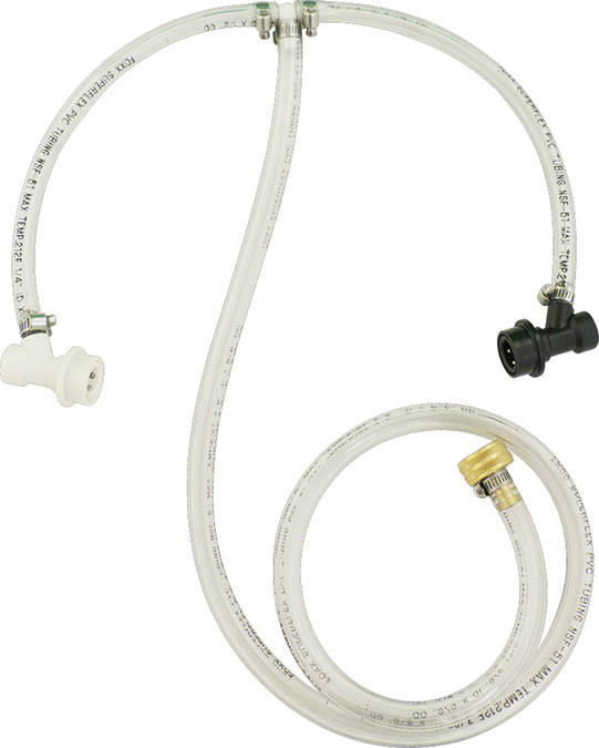 An inexpensive, time-saving assembly for rinsing out your Ball Lock kegs.,You've just finished a keg of your homebrew. Most of us set that keg aside and clean it later when we brew up the next batch. As it sits it gets harder to clean and then we definitely have to disassemble the entire keg to scrub all the parts. Well for years our Metal Shop Manager and lead Product Designer, Darren Schleth, has been using a simple keg cleaner in our R&D brewery to rinse his kegs, while upside down, through the body connects. The keg is instantly rinsed while all the residue is still soft. The keg can then later be soaked with PBW and/or sanitized without having to remove the body connects or poppets. This saves lots of time. As employees at MoreBeer! saw this simple assembly everybody wanted one of their own. ,To use: Connect the brass garden hose attachment to a garden hose. Then connect the grey and black quick disconnects to the inlet and outlet body connects on your Ball Lock keg. Remove the lid and turn the keg upside down. Turn on the water. Water risnes through both the inlet and outlet dip tubes completely rinsing the inside of the keg.,