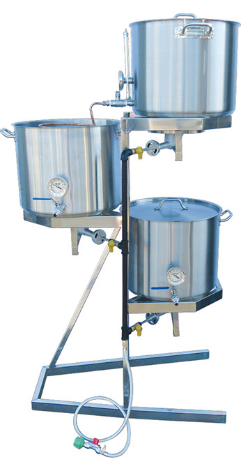 We call this the OG (Original Gravity) because it is our original all-grain gravity system first built in the 1990's. Designed by another OG, retired MoreBeer! partner Regan Dillon, this was the first commercially available all grain system that featured the boil kettle under the hot-liquor tank to save space. It features no pumps or electronics and is centered around the time tested physics of gravity!  Fluid flows from the Hot-Liquor tank on top, through the Mash Tun in the middle on into the Boil Kettle on the bottom. The OG comes with 15 gallon kettles which can be used to brew any sized batch between 5 and 10 gallons. ,This is truly the easiest to use all-grain system out there. With nothing electrical to go wrong, simple valves to control flow, easy to view mashtun, and no pumps its just plain easy. Even with a host of digital BrewScultpures and all kinds of other systems at our disposal we still really, really enjoy the simplicity of brewing on our Original Gravity system. And while simplicity rules on this system, you can of course add a pump to recirculate the mash or to push through a counterflow chiller at anytime.  ,The frame is made from 304 stainless steel and welded in our metal shop in California. The low profile, Heavy-Duty stainless steel kettles are formed in a mold via the use a punch. This means they are made from a single piece of stainless with no welded seams. These beefy kettles then get an added aluminum layer that is capped with another layer of stainless. The added aluminum helps keep the kettle bottom from scorching and allows for easier cleaning.   All the included ball-valves are made from stainless steel. Each kettle comes with a high quality Tel-True thermometer. Just a bullet proof package. ,,,Features:,,,304-Stainless Steel Frame made in USA,,,15 Gallon Heavy Duty Kettles,,,High-Quality Analog Tel-Tru Thermometers on All Kettles,,,Maximizers in All Kettles,,,Piped Propane Gas System with single regulator to run off one propane tank,,,Stainless Ball valves,,,Perforated stainless steel screen in Mashtun,,,MoreBeer! Stainless quick disconnects,,,Silicone tubing included for liquid transfer,,,Glass Sight Gauge on the Hot Liquor Tank,Base Dimensions:,,,54" Tall (Does not include height of kettles),,,25" Deep,,,36" Long,Warning:,,,Not intended for indoor use!