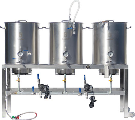The Low Rider BrewSculpture™,Easy accessibility is the name of the game with the Low Rider. The Low Rider is our top of the line Single Tier Brew Sculpture that allows you to look into and interact with every kettle without the need for a step or ladder. The easy access is one reason the Low Rider is preferred by professional breweries like Sierra Nevada and Russian River for test brewing.,Includes two pumps. Where the Tippy Dump system utilizes gravity to drain wort from the mashtun into the boil kettle, with the Single Level you use an additional March Pump instead.,Key Features of the Low Rider BrewSculpture™,,,Made in USA in the MoreBeer! Metal Shop,,,304 Stainless Steel TIG welded stands. The ultimate frame material that will outlast you. No paint or powder coating.,,,Every BrewSculpture™ includes folding handles and built-in rear casters that allow you to move your BrewSculpture™ with ease.,,,Oversized 304 stainless BrewBuilt Kettles with welded fittings, notched lids, internally etched volume markers, aluminum clad bottoms, and silicone handles. Built to last.,,,Our "Large" option will come with 22 gallon kettles, while the "XL" model will come with 30 gallon kettles. ,,,The fluid path is easy to use and clean. We've included the time tested, top of the line March pumps along with heat resistant food-grade silicone tubing and our own specially designed stainless quick disconnects.,,,Burners are fast, efficient, quiet and have great flame control.,,,Mashtun includes the Ultimate Sparge Arm with innovative design to eliminate hot-side aeration. The center draw outlet with quick disconnect is locked in during mashing but easily disconnects for cleaning. The mash screen has a very low volume of base water under the screen to aid with efficiency and mash consistency. The perforated stainless mash screen is reinforced for use with pump recirculation and includes a silicone gasket to make a perfect seal with the kettle wall. Internally etched volume markers make mash water additions super easy.,,,Boil Kettle includes innovative Whirlpool maker for leaving hops and trub behind. Volume markers are etched on the inside so you know exactly how much wort you have at all times. The lid notch is super handy for hanging hop bags, using an immersion chiller, etc., but when not is use an included silicone plug seals the notch. The bottom of the boil kettle is tri-clad with a 4mm aluminum core sandwiched between two layers of 304 stainless. The aluminum core eliminates scorching and the cleaning that comes with a scorched kettle.