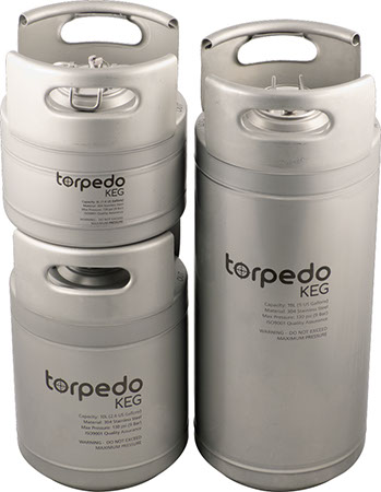 Set your sights on a brand new Torpedo Keg! The sleek all-stainless design represents a new era of homebrew kegs. With features like welded stainless handles, the ability to stack with fittings in place, amazing quality and a great price we think these kegs will become the standard by which other kegs are measured. ,Quality First,The first thing we at MoreBeer! check out is interior welds. We've spent a decade rejecting kegs made overseas because the interior welds have never met our standards. If a weld is not perfect and shows evident burn marks along with nooks and crannies it cannot be sanitized effectively. Torpedo kegs are machine welded and exceed our standards for quality. The weld quality is possible because these kegs made by an ISO certified commercial keg manufacturer.,Cool Features,Torpedo Kegs were designed to stack with Ball Lock quick disconnects in place and serving which is a cool feature for some brewers who have vertical space in their refrigerator. We also like the rolled stainless steel handles. They are comfortable to grab and will never come off like some rubber handles can over time. In and Out is etched near the keg posts for easy identification which is very handy when you are connecting lines in a refrigerator or kegerator and trying not to make a mistake. ,Overall for the price and quality, along with free shipping from MoreBeer!, the Torpedo Keg is an amazing value!,Dimensions:,,,,,,,,,,,,,,,,,, ,,,,,,,Height (in.),,,,,,,Diameter (in.),,,,,,,,,,,1.5 Gal,,,,,,,10,,,,,,,9.125,,,,,,,,,,,2.5 Gal,,,,,,,14.5,,,,,,,9.125,,,,,,,,,,,5 Gal,,,,,,,22.75,,,,,,,9.125,,,, ,Please Note: These are about 1/2" wider than standard Ball Lock Cornelius Kegs.