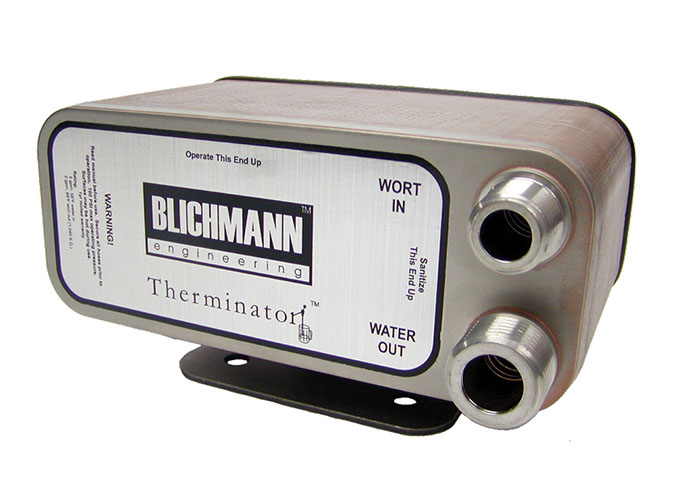 The Blichmann Therminator Wort Chiller is one of the most popular tools to use when chilling your wort, as it gets the job done quickly, effectively and without much effort from you. This particular chiller has 40 plates and 316 stainless steel plates and fittings. It features ½ inch MPT for the wort in and out, and a ¾ inch MPT garden hose thread for the water in and out. You’ll be able to chill just like the pros when you use the Blichmann Therminator Wort Chiller, as it is extremely similar to the chillers used in commercial breweries.,The Therminator chiller is small but mighty, with the capability to chill 10 gallons of wort down to 68 degrees when using 58 degree water in just five minutes! It measures an ultra compact 7.5 inches wide, 4 inches deep and 3 inches high, which also makes it very easy to clean and sanitize. It is brazed together with pure copper in an oxygen-free furnace so there are no potential leaks, and it even comes with heavy gauge stainless mounting bracket to keep your system looking sturdy and seamless. , ,,,All 316 stainless steel plates and fittings.,,,Chill like the pro's - Identical to commercial brewery chillers.,,,Brazed together with pure copper in an oxygen free furnace - no potential leaks like a gasketed unit.,,,Chill 10 gal in 5 min to 68°F using 58°F cooling water at 5 gpm.,,,Ultra compact (7.5" W, 4" D, 3" H),,,Easy to clean and sanitize - small enough to boil!,,,Garden hose thread connections on water side - no extra adapters to buy.,,,1/2" male NPT fittings on wort side mates up with virtually all common hose connector types. Much easier to sanitize than female fittings.,,,Comes with heavy gauge stainless mounting bracket